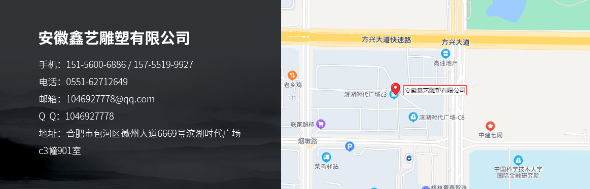 安徽鑫藝雕塑有限公司 是一家集研發設計、制作、安裝一體化的實力型現代雕塑公司。公司重視城市發展環境,追求空間與創意性建筑的結合,團隊擁有眾多雕塑設計師。創作設計、模型制作、產品成型一條龍制作工藝,可制作中式、歐式各種材質的雕塑和工藝品系列(砂巖、漢白玉、琉璃造型、樹脂透花等),以及各種高消費場所貼金工程。業務區域:合肥雕塑公司、安徽浮雕公司、合肥浮雕制作、合肥雕塑制作、安徽雕塑制作、合肥雕塑廠、合...